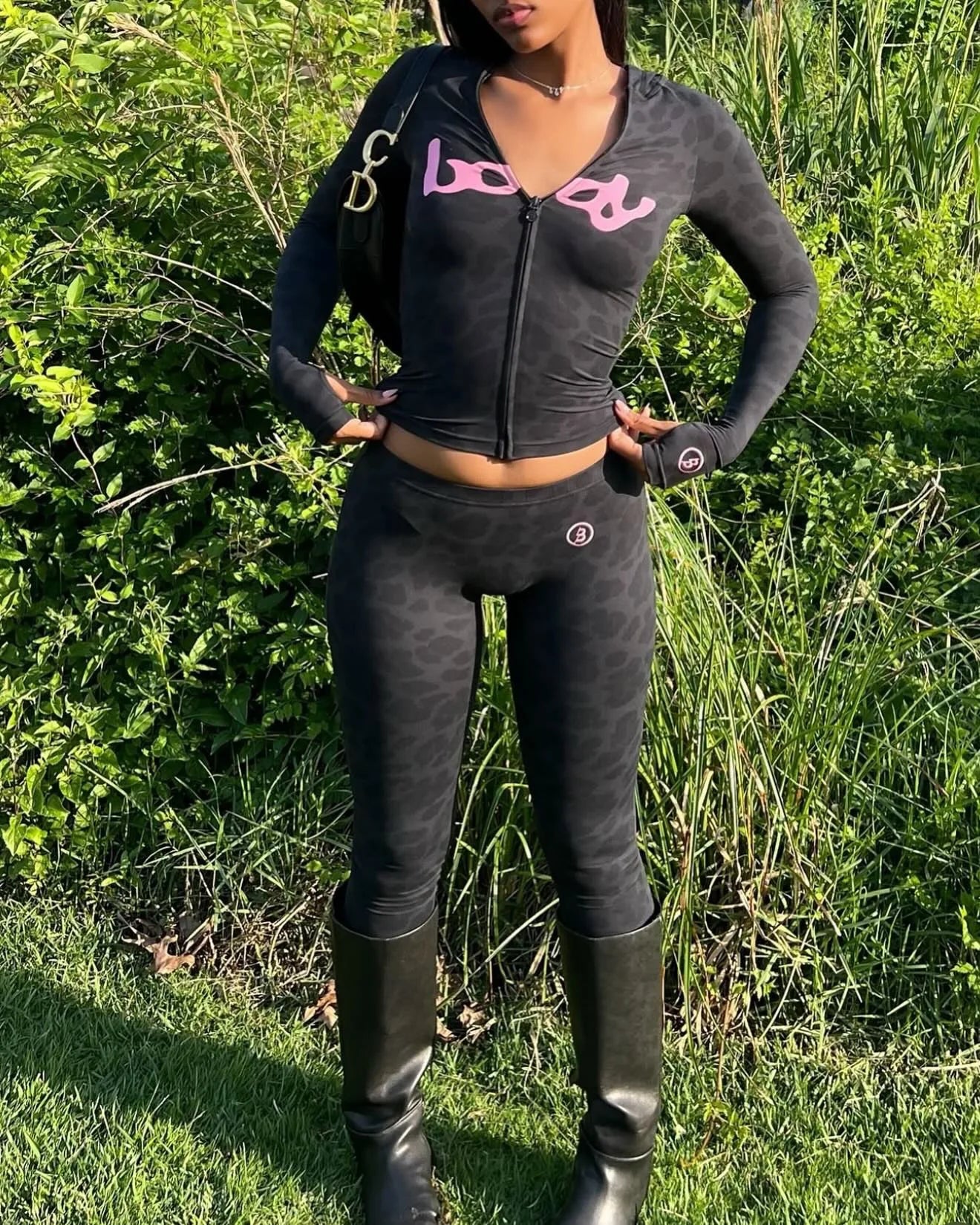 2025 Autumn New Style Cross-border European-American Stylish Letter-Printed Hooded Long-Sleeved Blouse and Pants Set for Versati