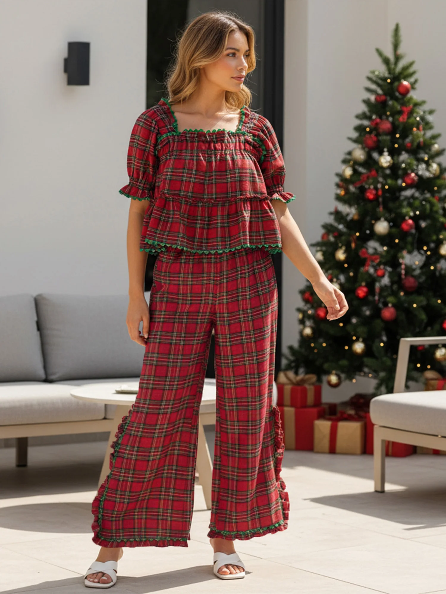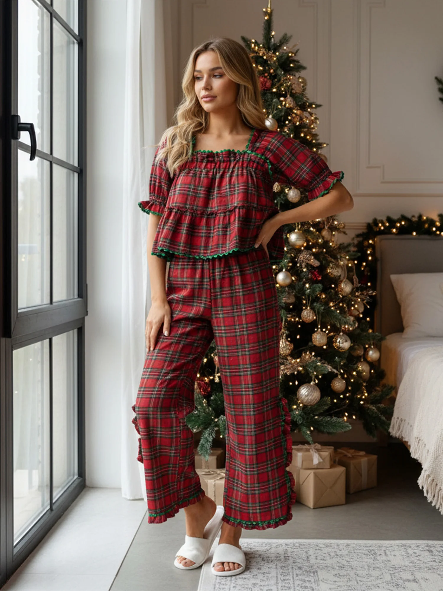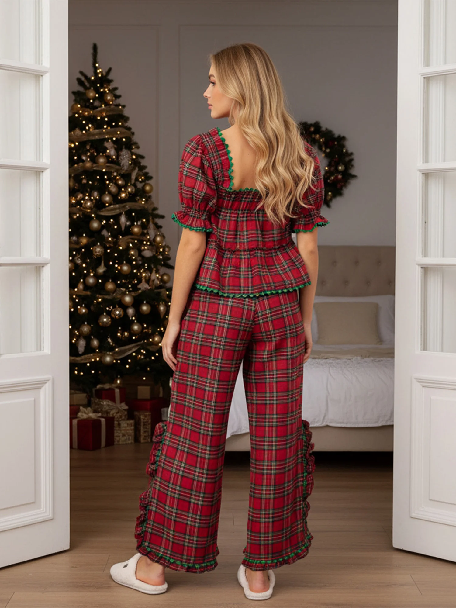 2026 New Years Spring Stripes/Plaid Short Sleeve Square Neck T-shirt with Pants Sleepwear Loungewear Xmas Women Pajama Set