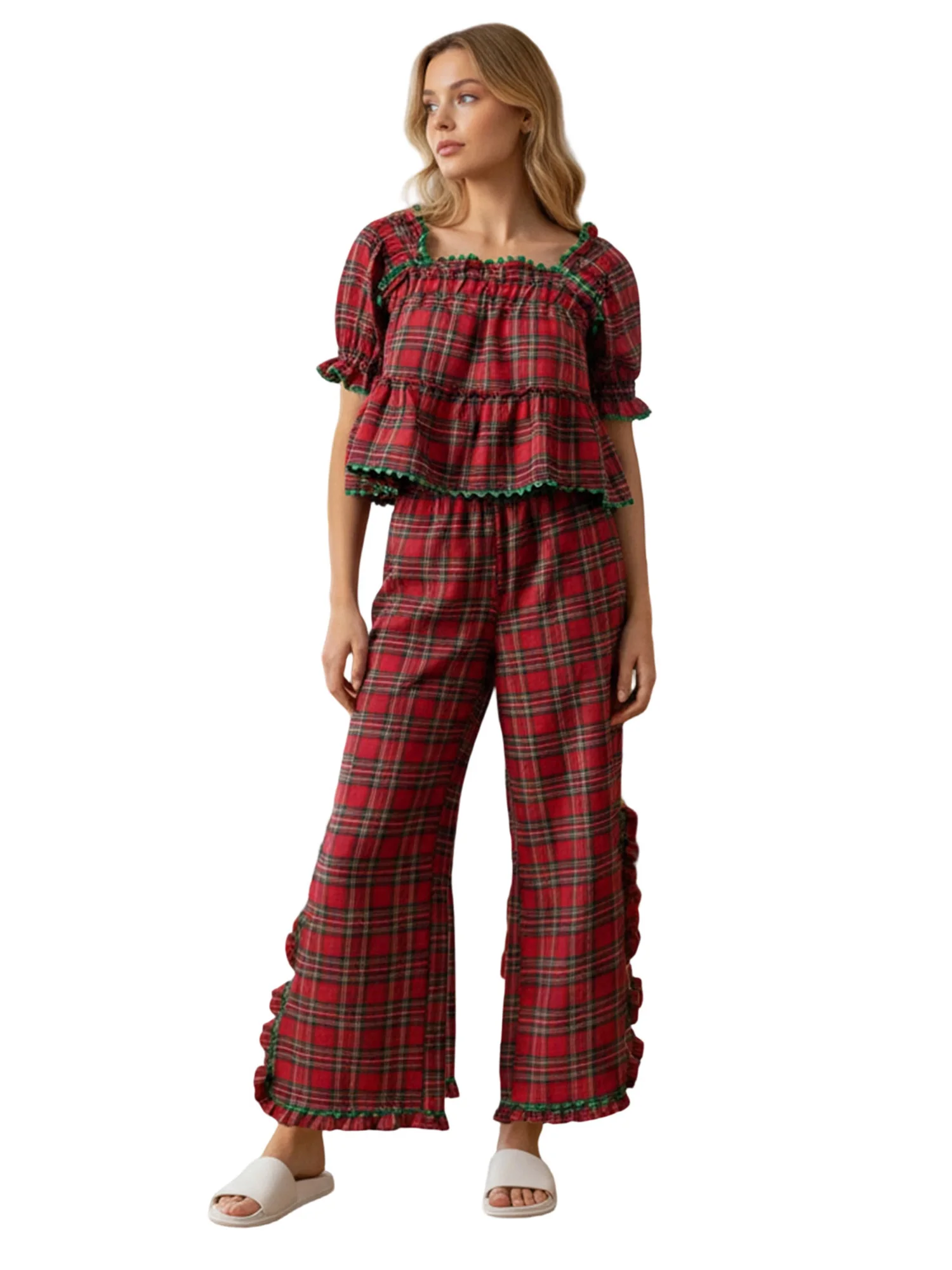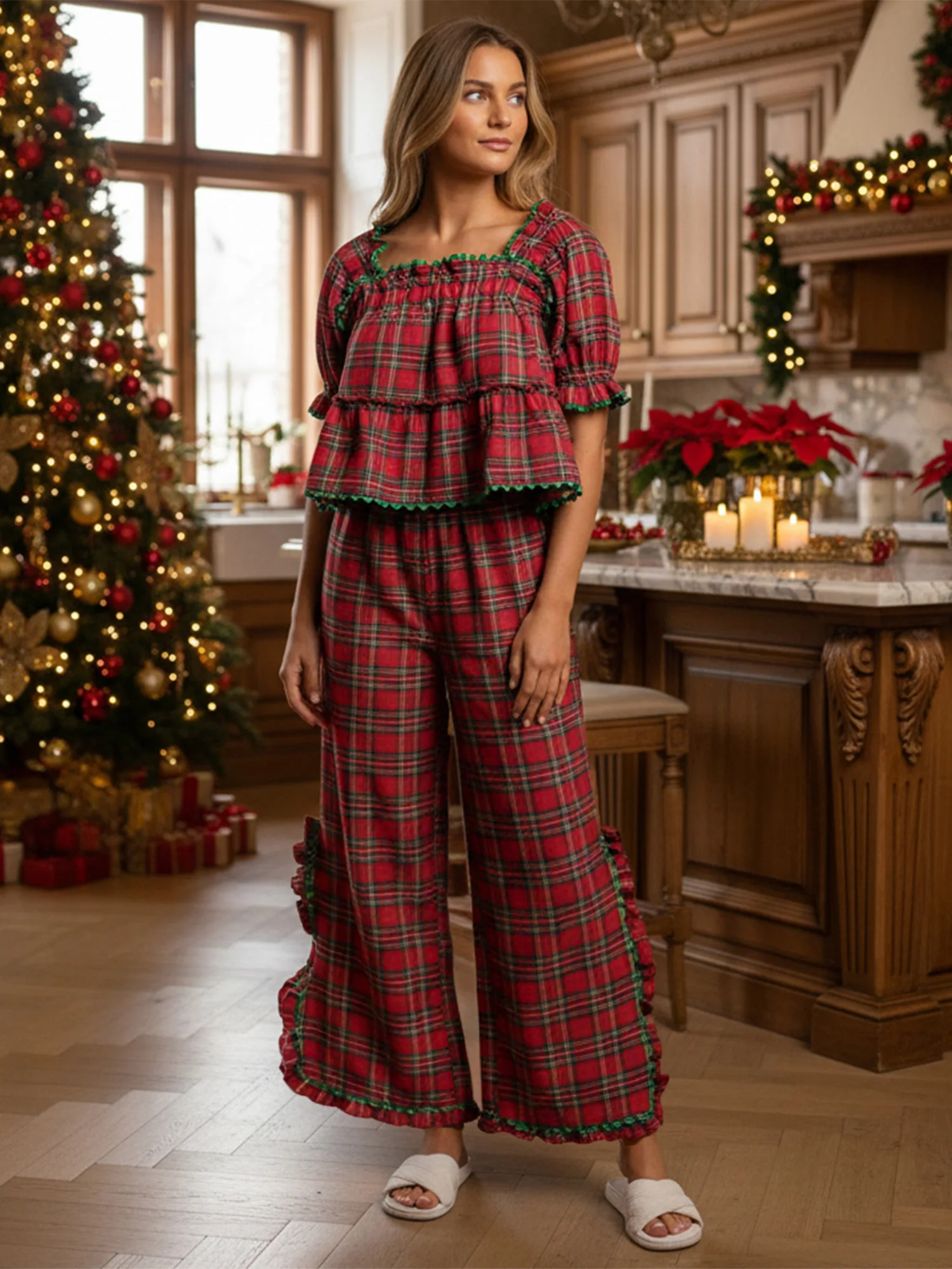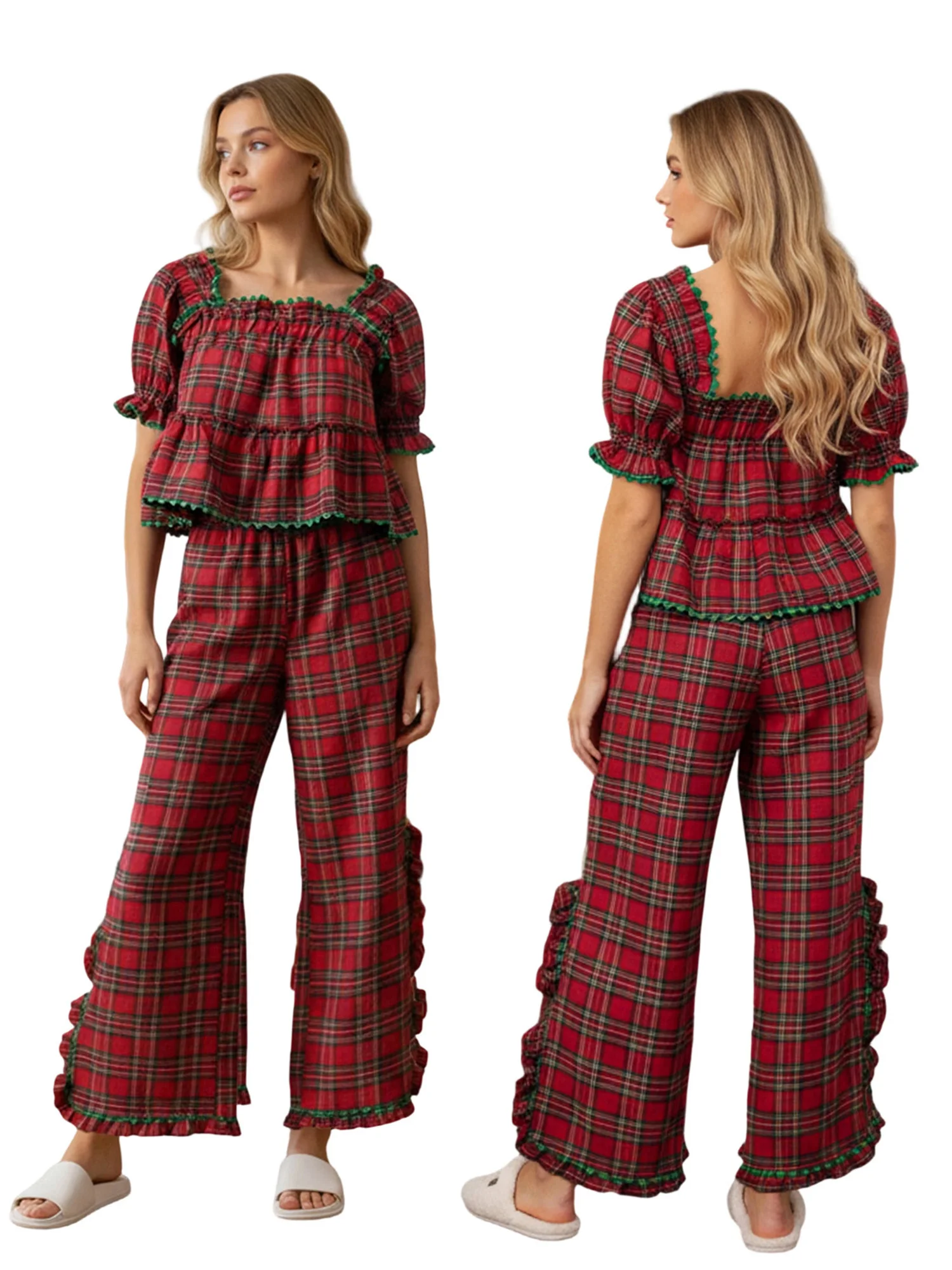 2026 New Years Spring Stripes/Plaid Short Sleeve Square Neck T-shirt with Pants Sleepwear Loungewear Xmas Women Pajama Set
