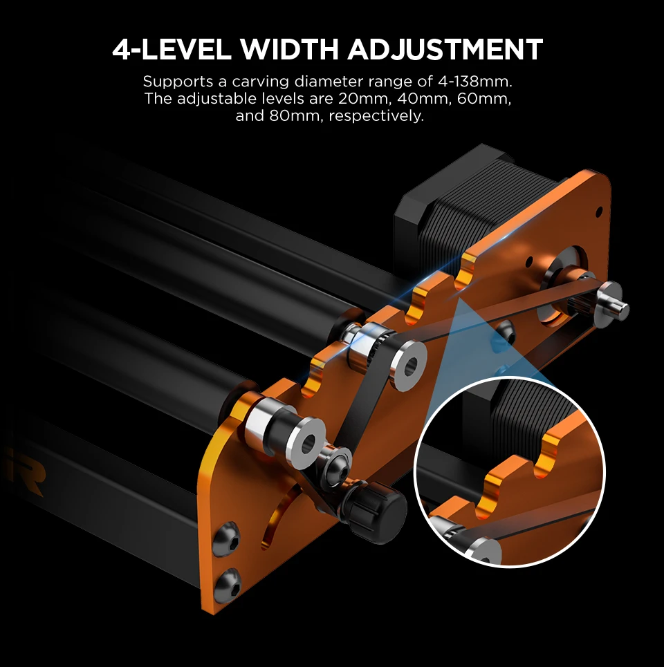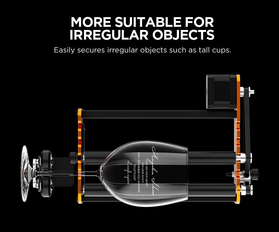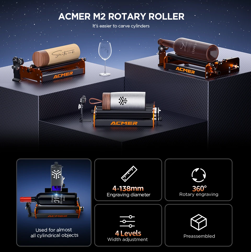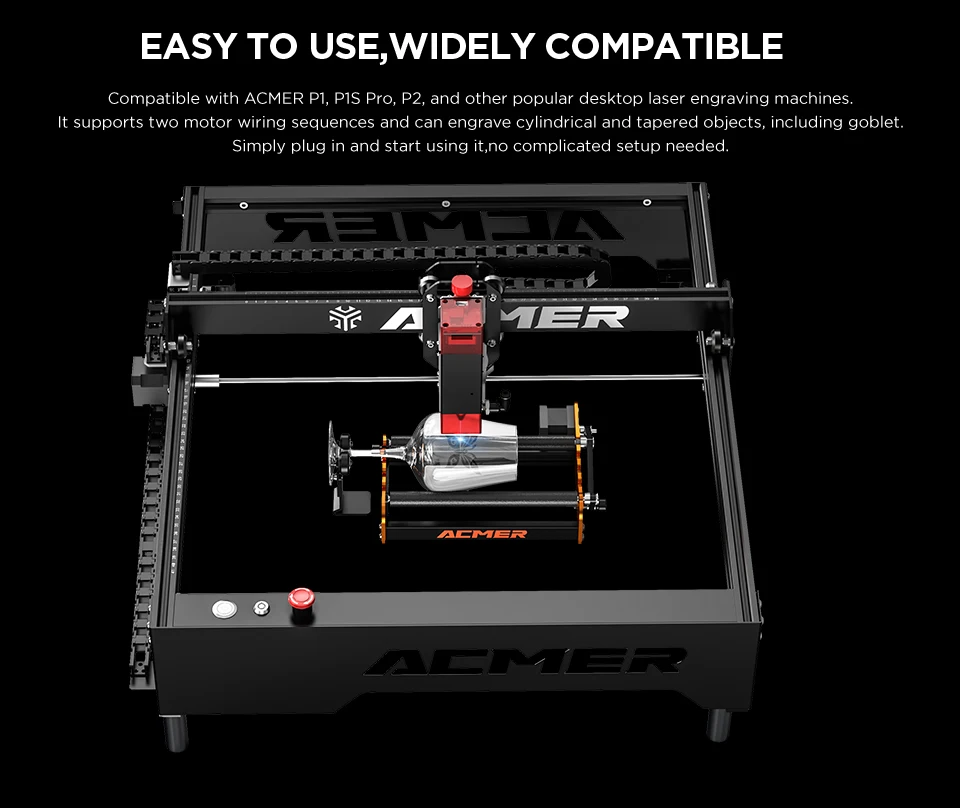 Compatible with ACMER P1, PIS Pro, P2, and other popular desktop laser engraving machines. It supports two motor wiring sequences and can engrave cylindrical and tapered objects, including goblet. Simply plug in and start using it,no complicated setup needed.
