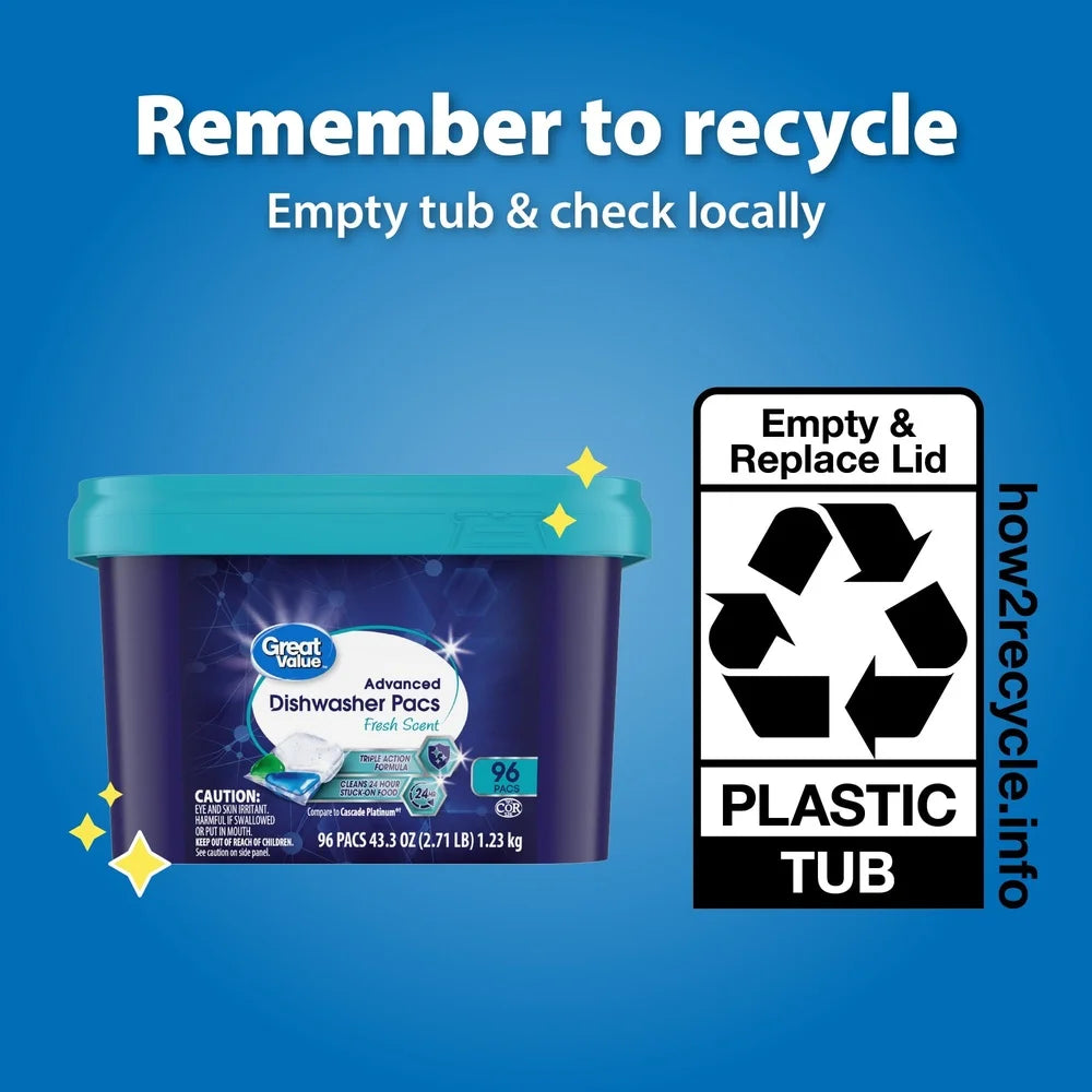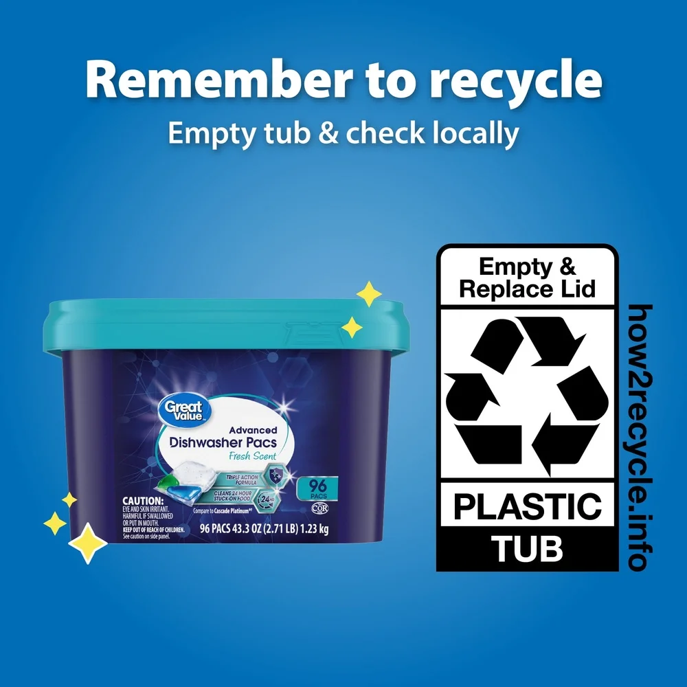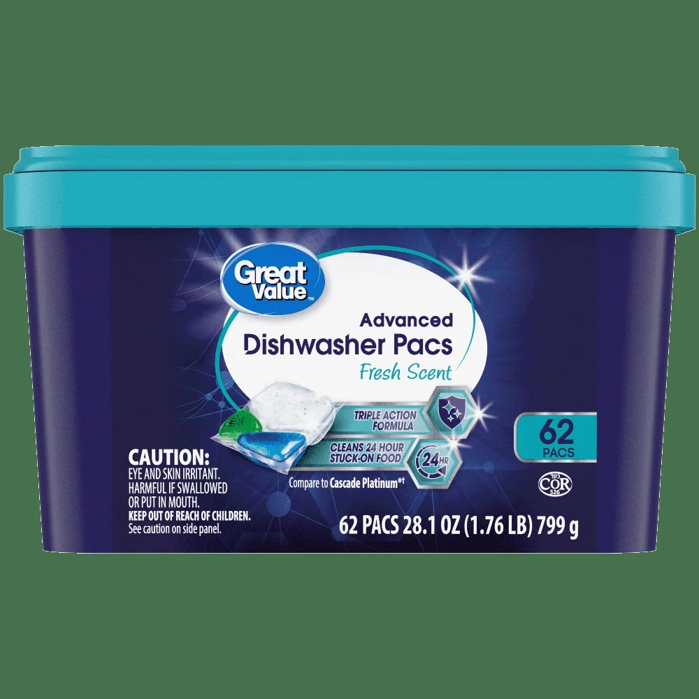 Advanced Automatic Dishwasher Pacs 62 Count Fresh Scent Triple Action Formula Tough on Grease Stains Residue No Pre-Rinse Safe