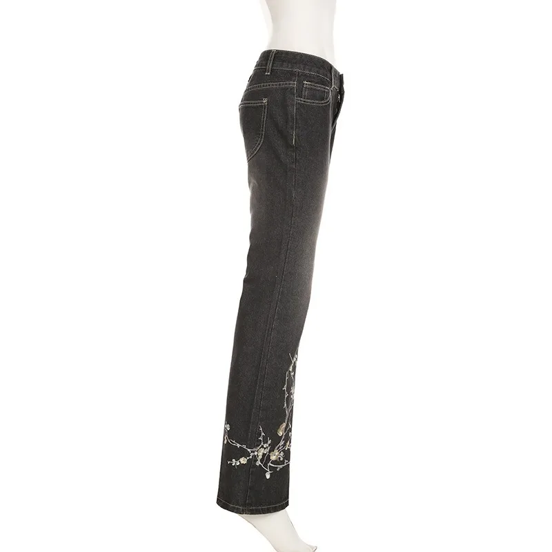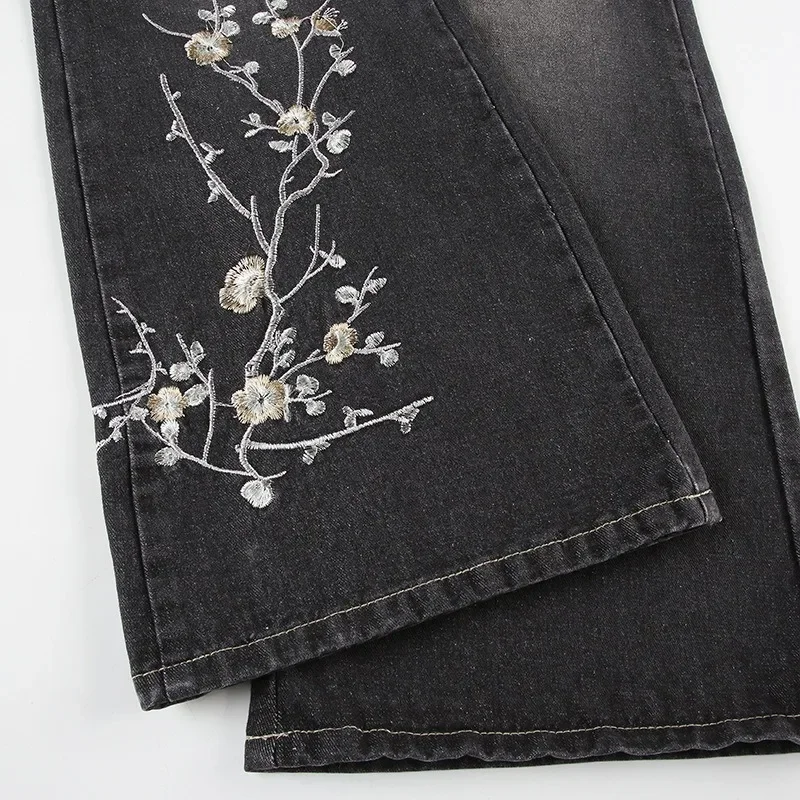 Floral Embroidery Jeans Vintage 2000s Low Rise Flared Jeans Women Retro Y2k Baggy Denim Pants High Street Basic Trousers