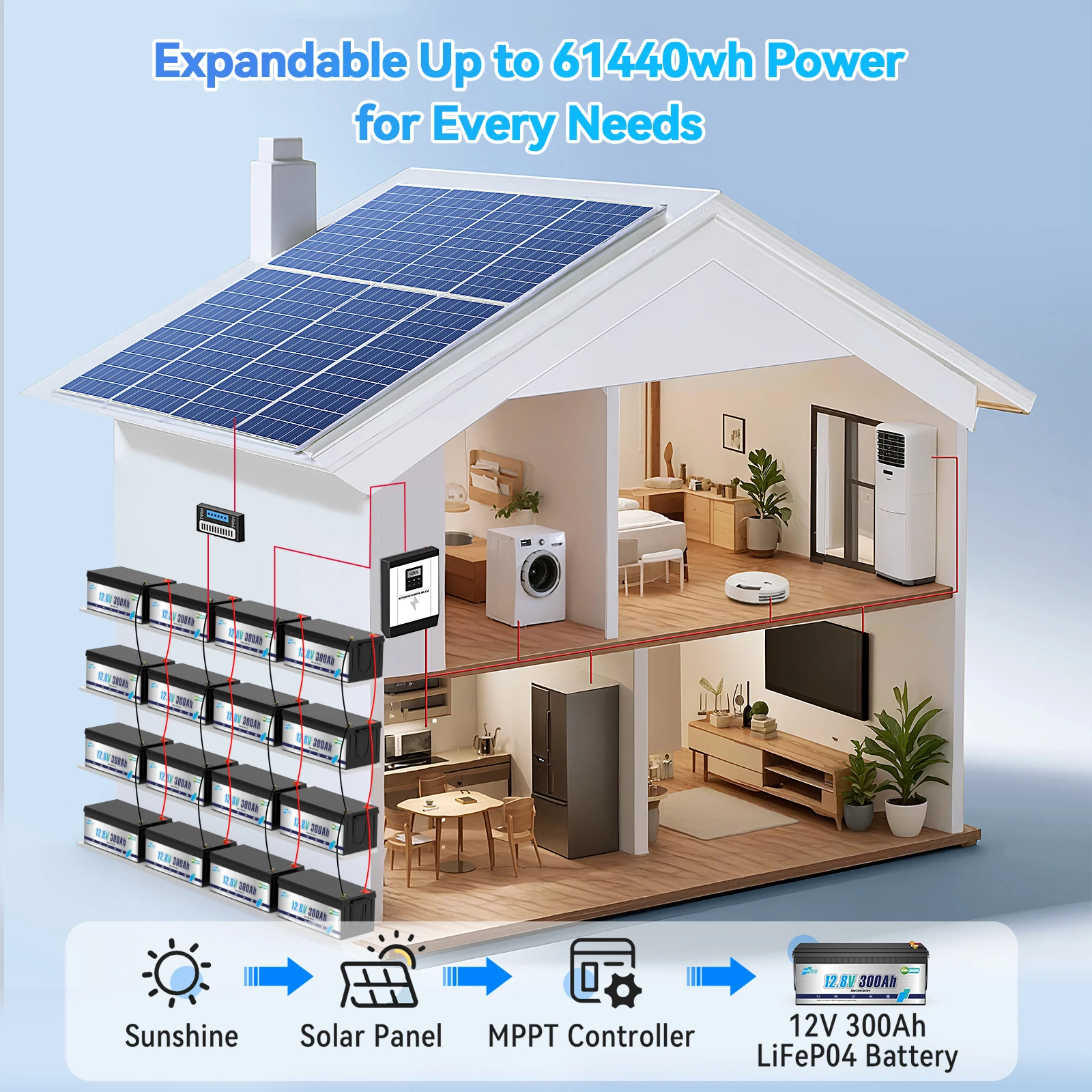 【Up to 8000+ Deep Cycles】 12V 300Ah LiFePO4 battery can reach 5000~15000 deep cycles, which is equivalent to 3 lead-acid batteries.