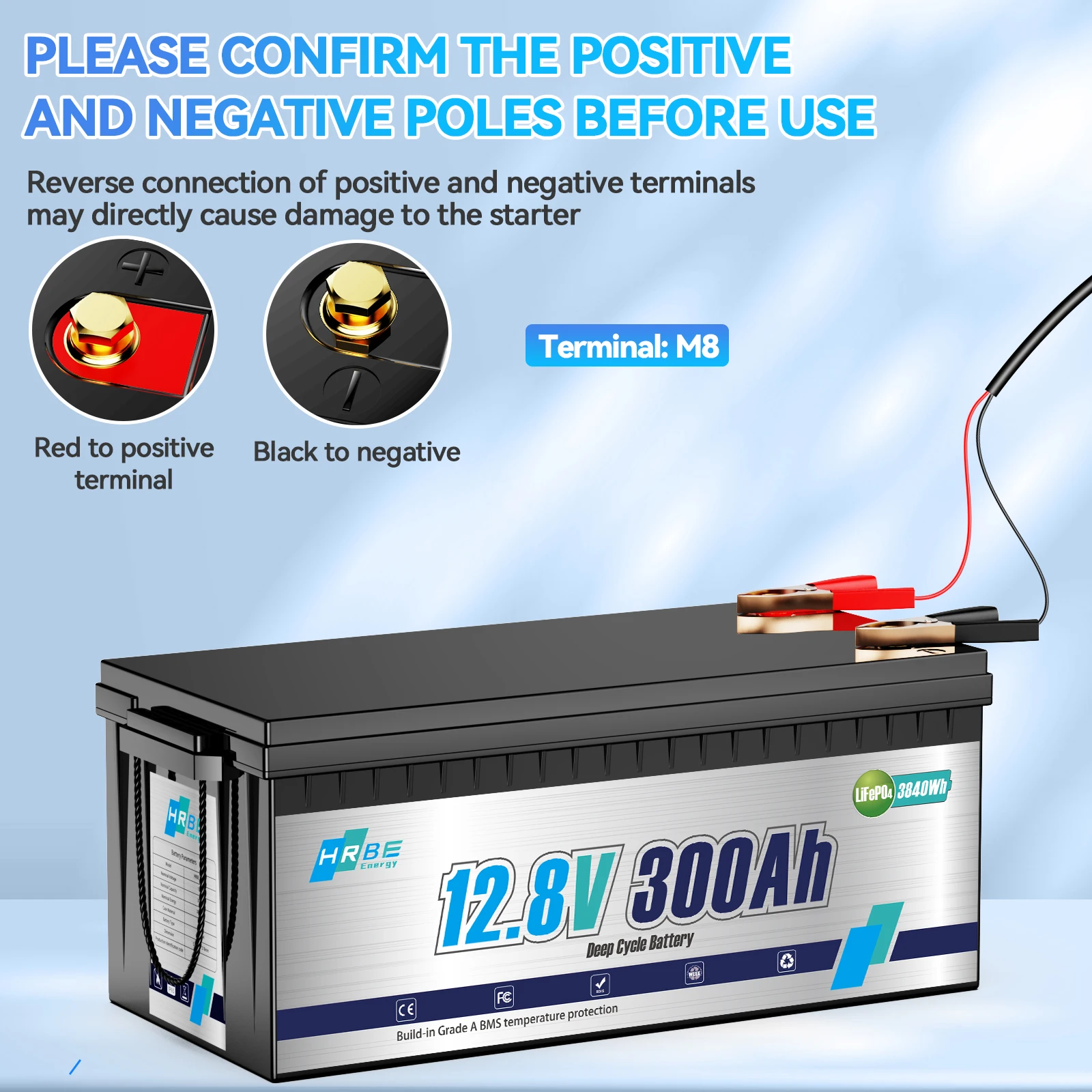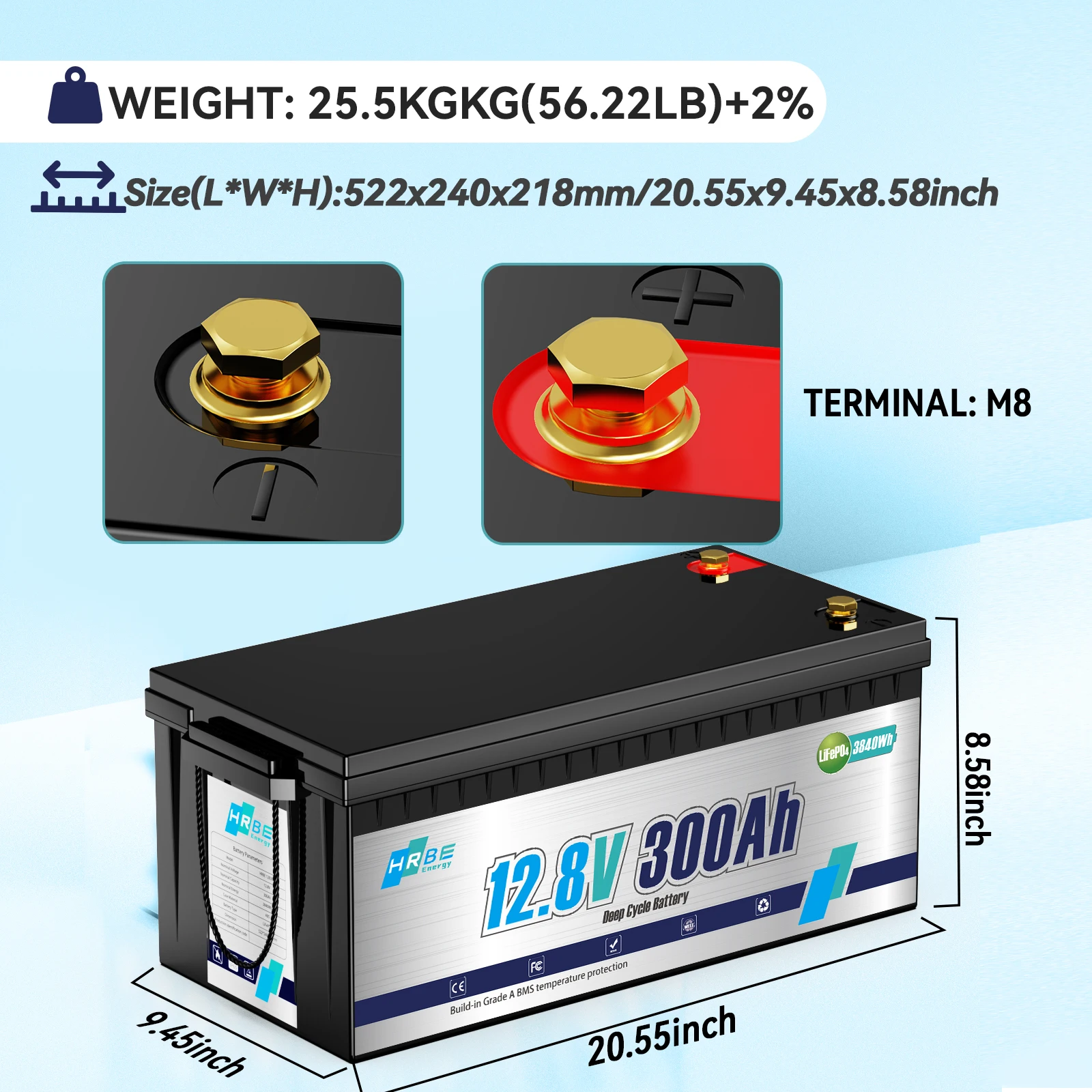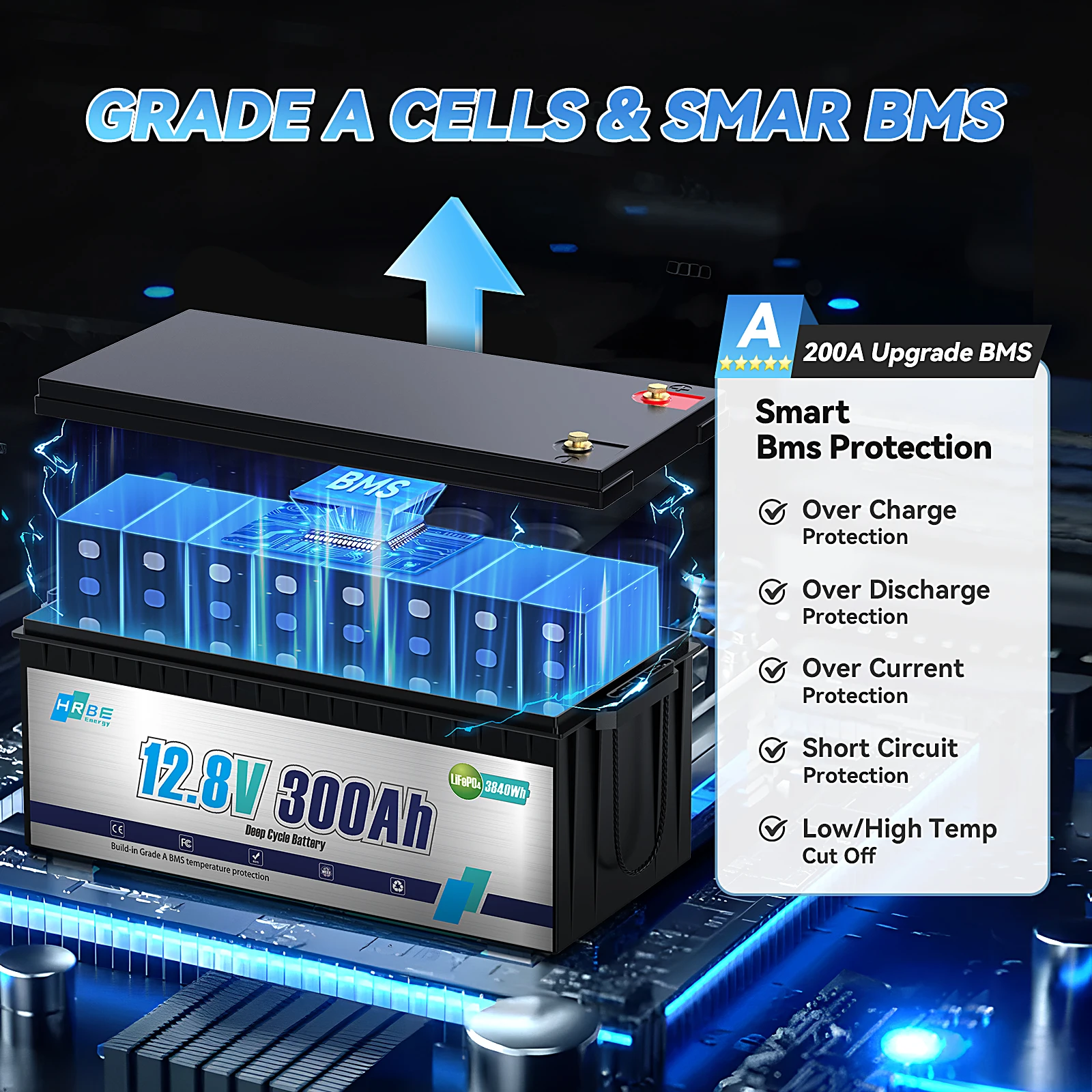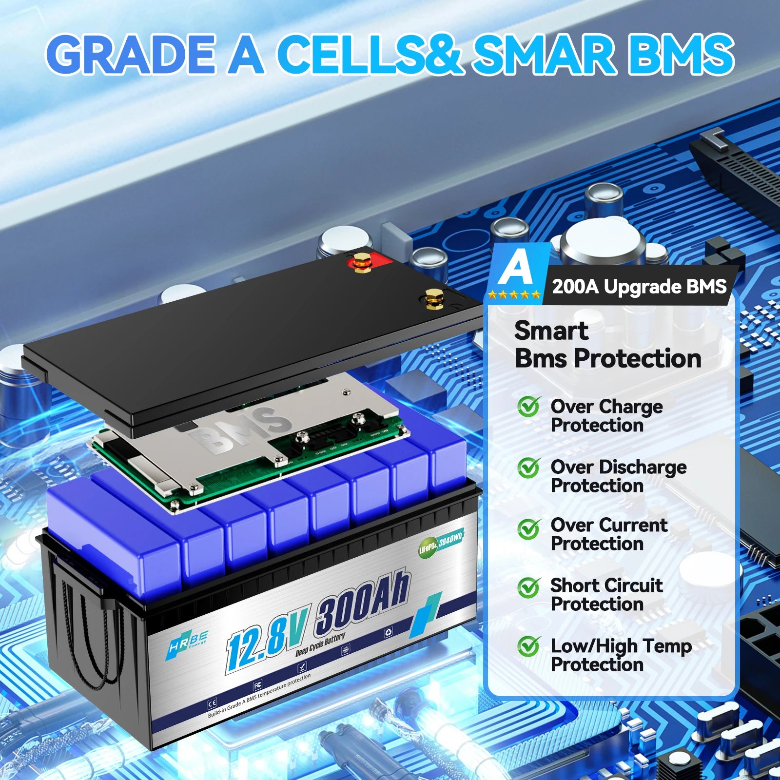 HRBEEnergy 12V 300AH LiFePO4 Lithium Battery Pack RV Batteries For Marine Solar Trolling Motor Motorhome Camper With 200A BMS