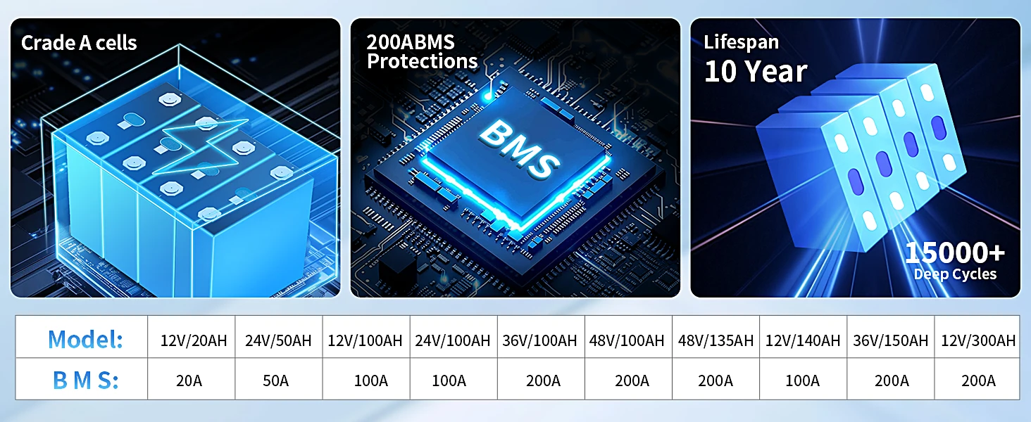 【200A BMS & Low-Temp Protection】 BMS (Battery Management System), over-charging protection, over-discharging protection, high/LOW temperature protection, short-circuit protection, over-current protection. And keep the balance between cells.