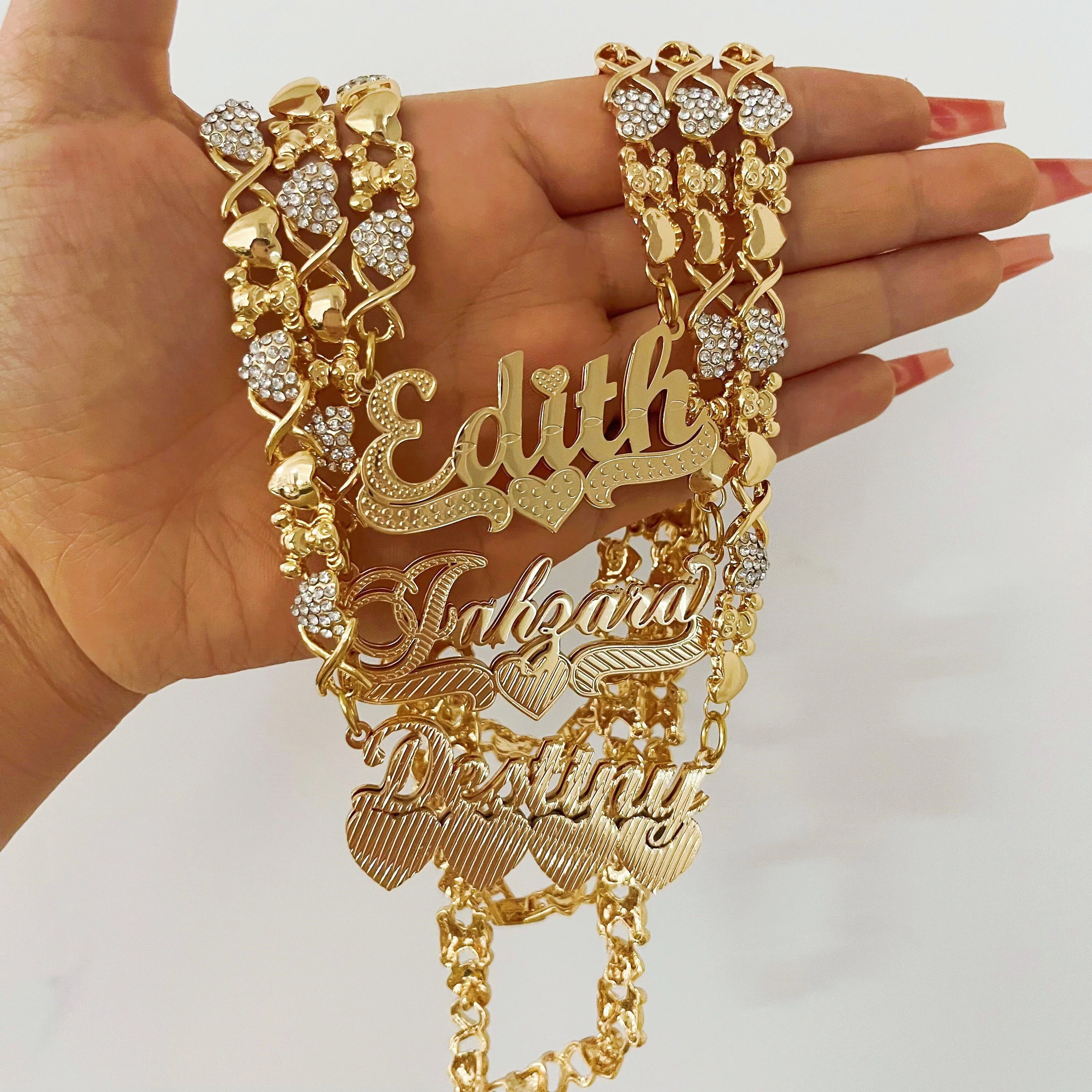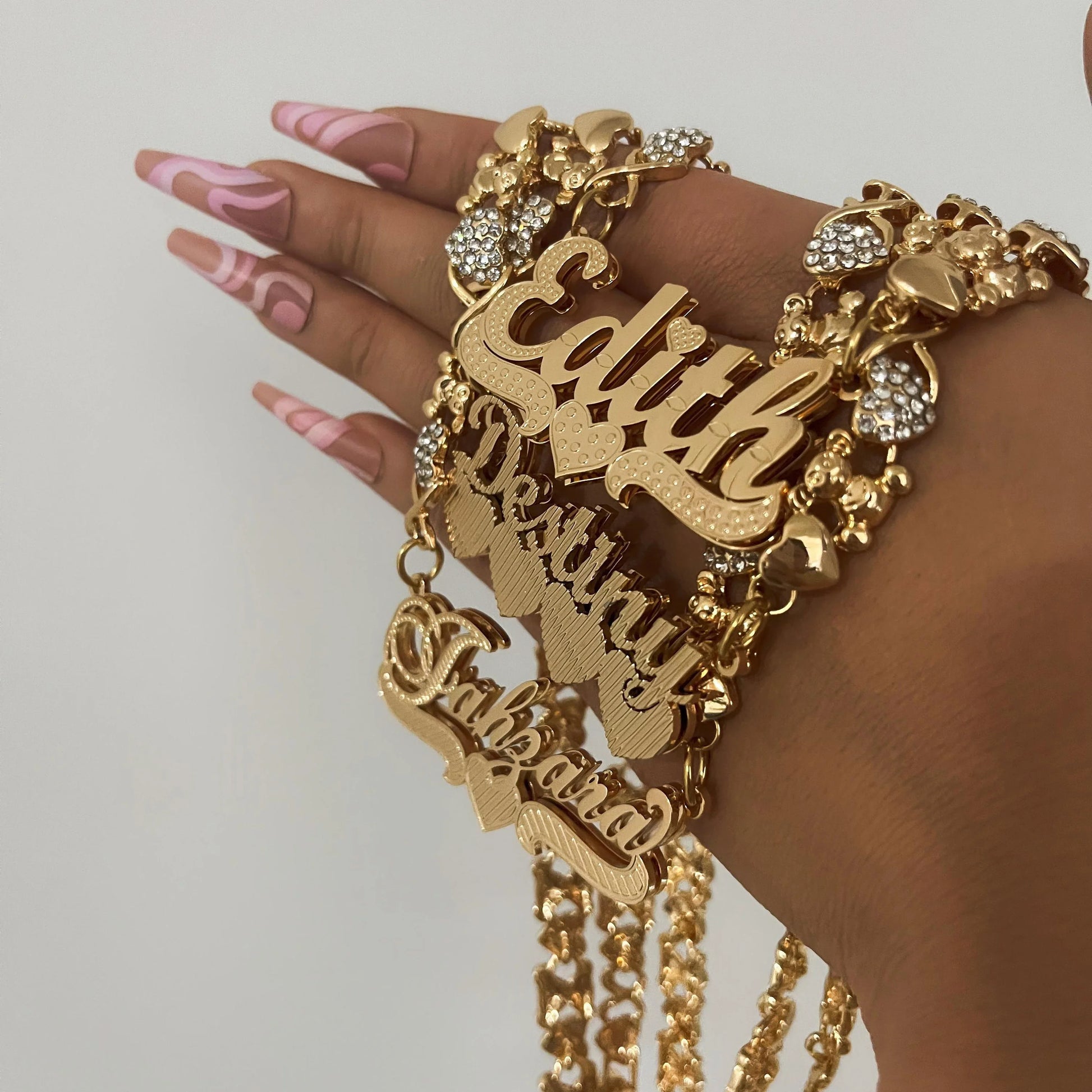 Personalized Teddy Bear Chain Name Necklace with Diamond 3D Double-layer Nameplate DIY Custom Name Necklace Golden Women's Gift