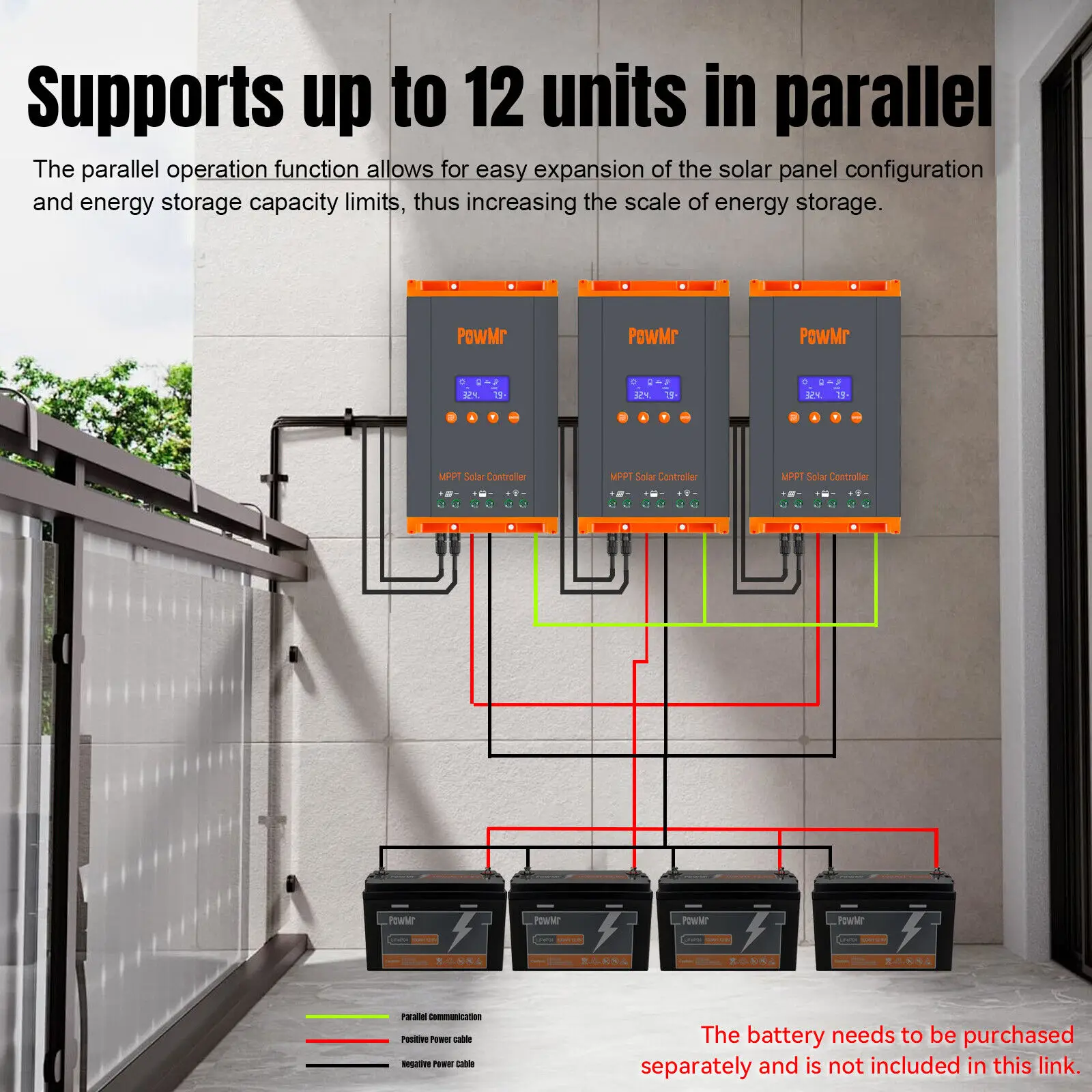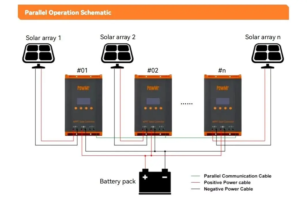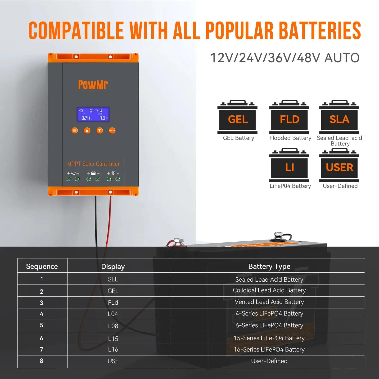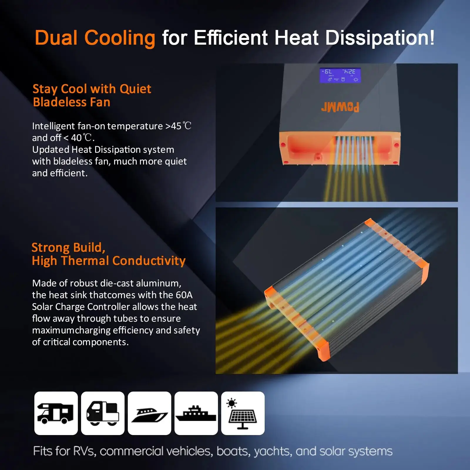 The latest version of the POWMR 60A MPPT (HHJ60-Pro) solar charge controller, 12V/24/36/48V Auto, Max PV 160V, Common Negative Ground, features advanced MPPT technology with high tracking efficiency of 99.5% and peak conversion efficiency of 98%. Maximize the energy from solar panels to charge your battery for off-grid solar systems.