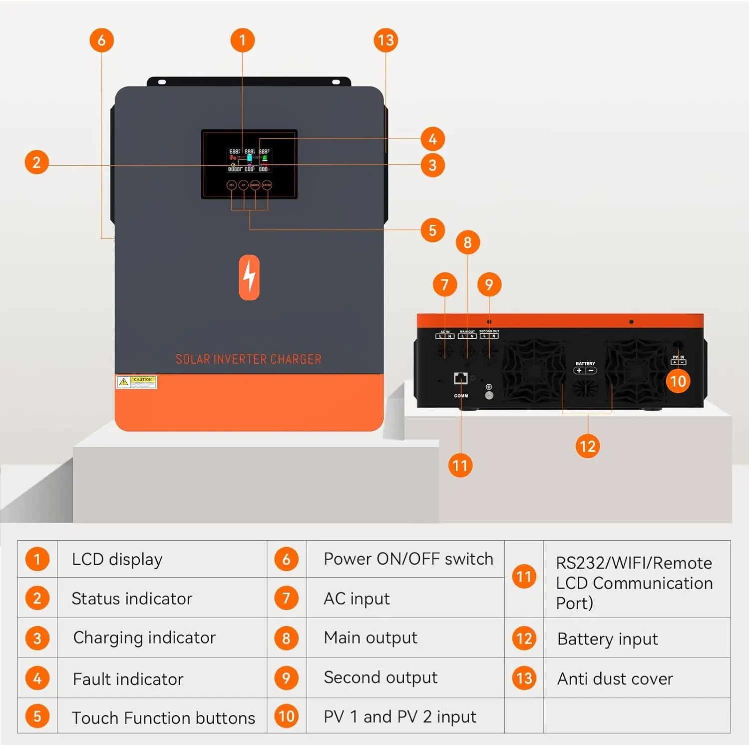 This is a multi-function inverter/charger, combining functions of inverter, solar charger and battery charger to offer uninterruptible power support with portable size. Its comprehensive LCD display offers user-configurable and easy-accessible button operation such as battery charging current, AC/solar charger priority, and acceptable input voltage based on different applications.