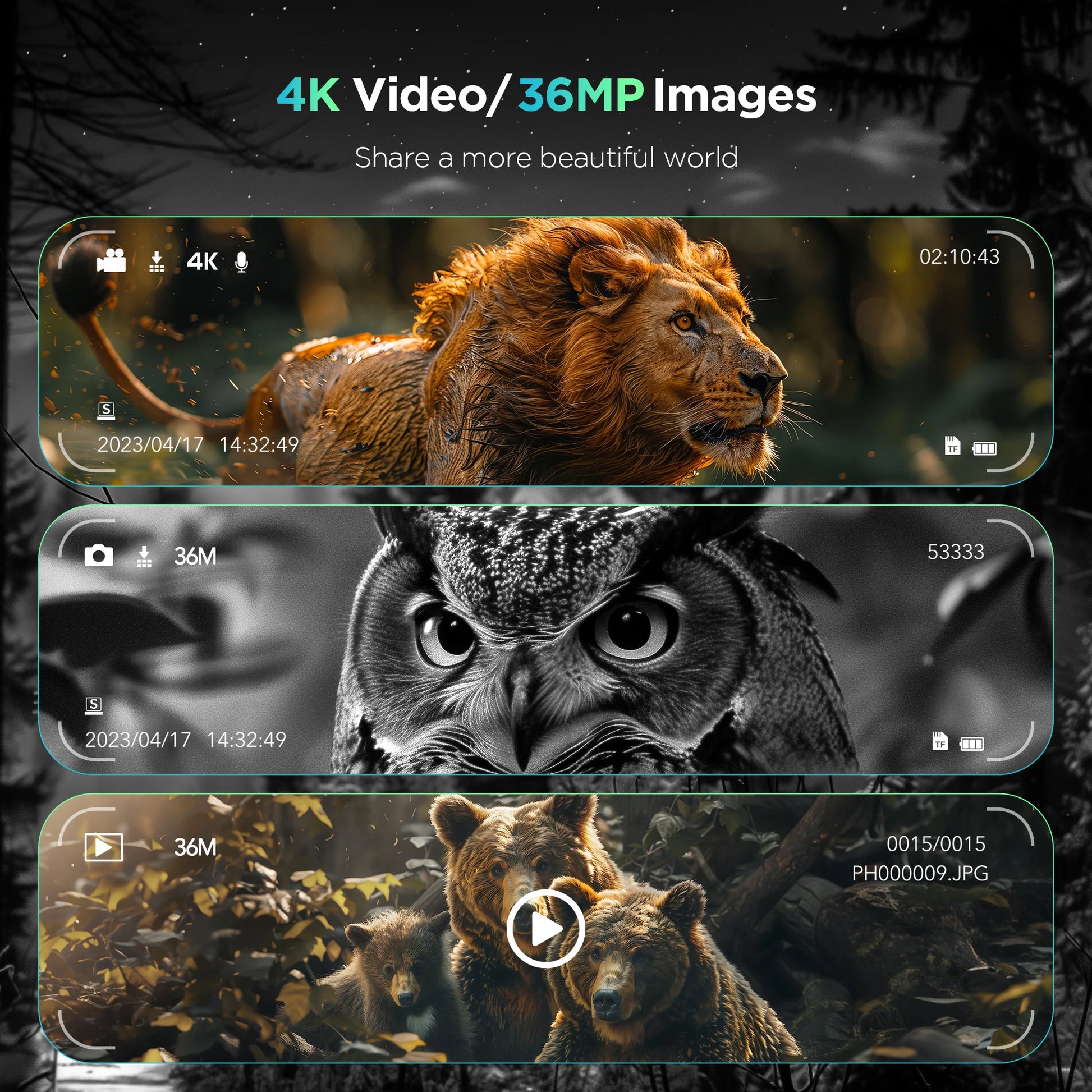 【4K Binoculars】Capable of recording UHD 4K videos with sound and snapping sharp 36MP images in the daytime, low light or nighttime, also support playback function. With 8X digital zoom and 7 IR illuminator levels, offers superior visibility and clarity.