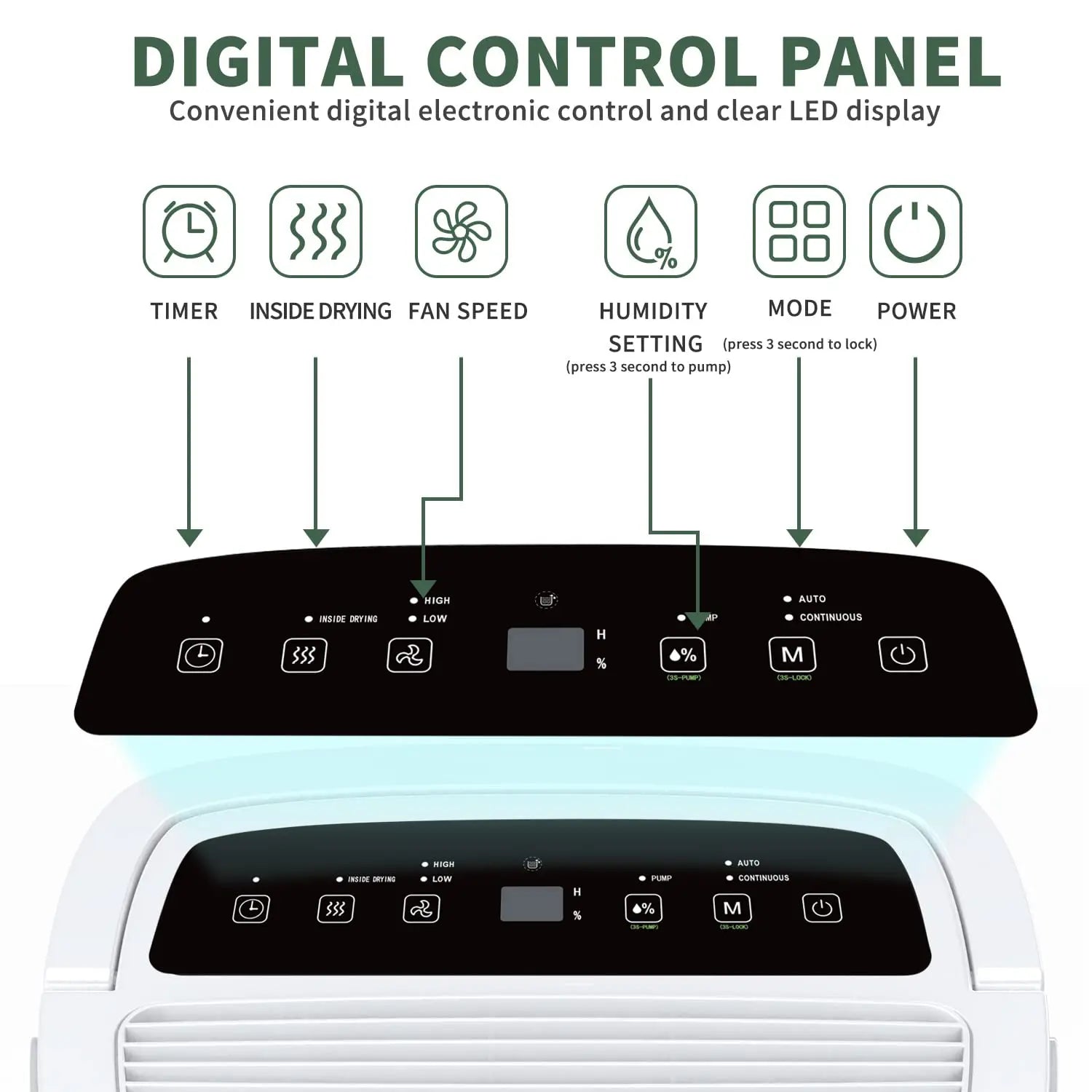Function: Adjustable Humidistat,Auto Restart,Automatic Bucket Full Shut-Off,Automatic Defrost,Automatic Humidistat Control,Bucket Full Indicator Light,External Drain Connect,LED Display,Removable Water Tank,Washable Air Filter