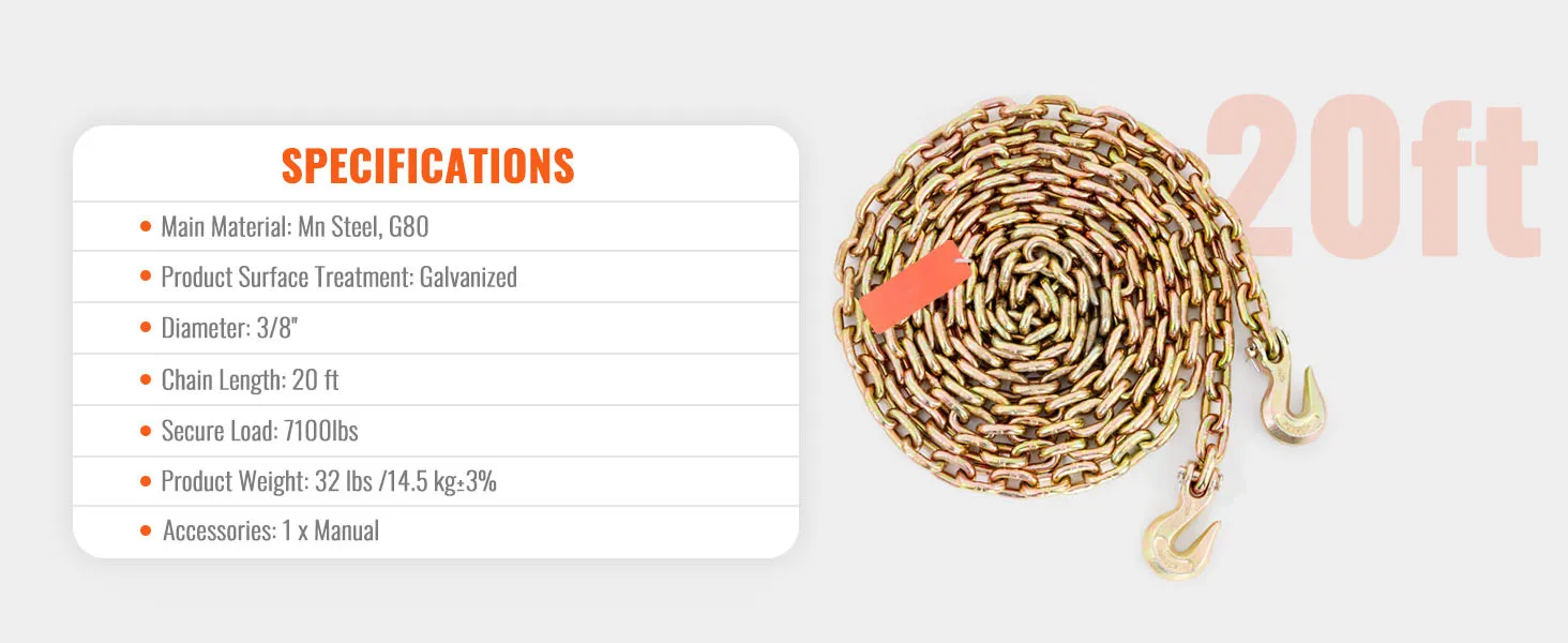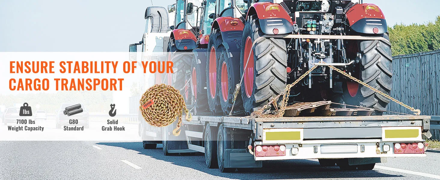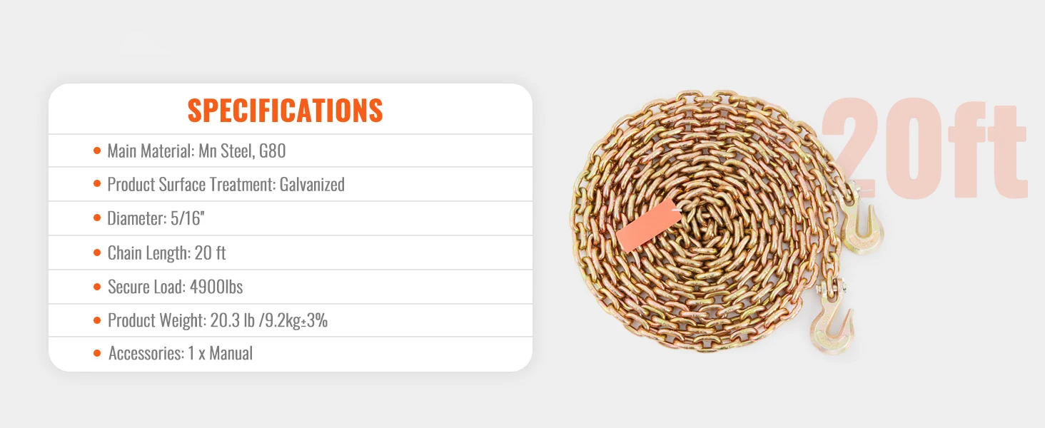 Secure & Reliable: This transport chain meets the relevant requirements of DOT with imprint marks on each section. It can resist the wear and tear of heavy objects. Use within the safe load range. If you have any questions, feel free to contact us.