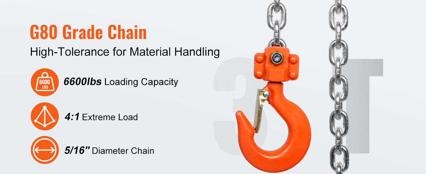 Reliable Brake System: Weston style dual-pawl brake design distributes load to opposite sides of gears to improve load safety. The industrial grade alloy steel hook can rotate 360° for easy lifting.