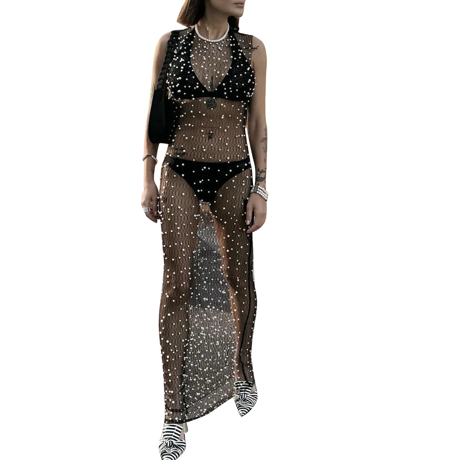 Women's Sheer Mesh Dress Sleeveless Round Neck Pearl Long Dress Bikini Cover Up DressFeatures: