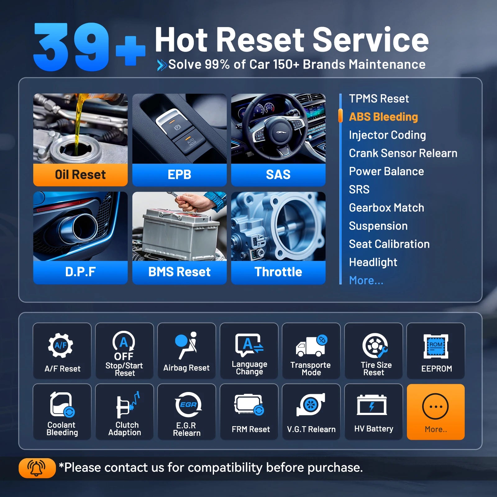 XTOOL D7S Automotive Scanner Diagnostic Tool not only offers 39 popular services like Oil Reset, ABS Bleed, EPB, SAS, Throttle, Injector Coding, etc., but also comes with various vehicle-specific special functions like Cylinder Power Balance, ABS Initialization, Crankshaft relearn, Zero Point Calibration, Fuel Trim Reset, SWS Initialization, etc.